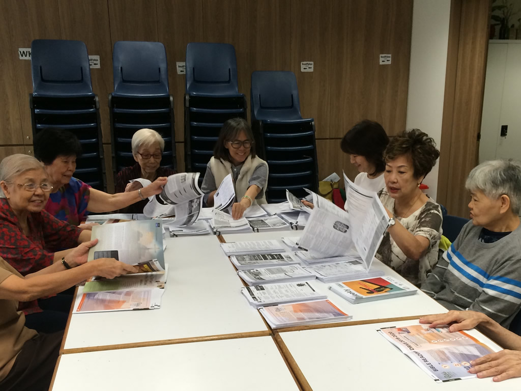 Every Friday at 9.45am, come rain or shine, you’ll be sure to find members of the Collating Ministry seated at the Level 2 Hall, diligently collating each page of the Wesley Weekly. In a process that spans more than one and a half hours, volunteers work hard at placing every page of every booklet in order. Together, the team collates an average of 1,000 copies of the Wesley Weekly each week.